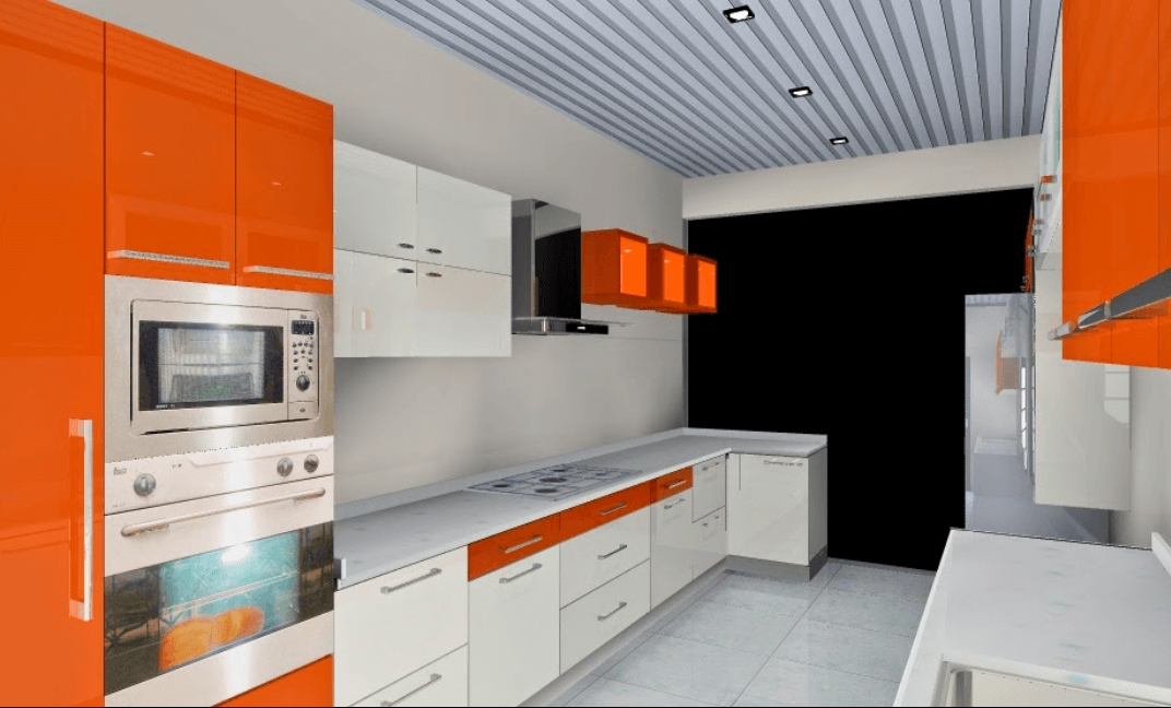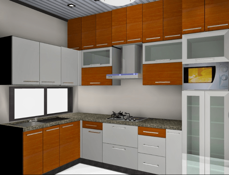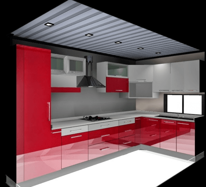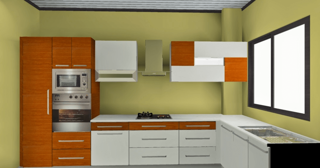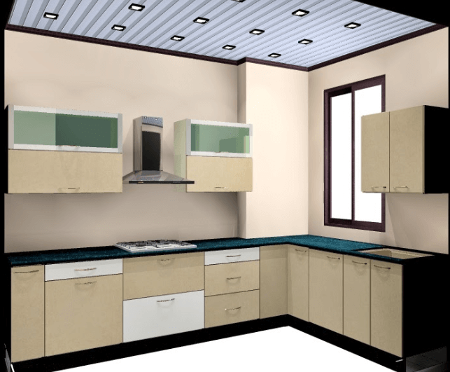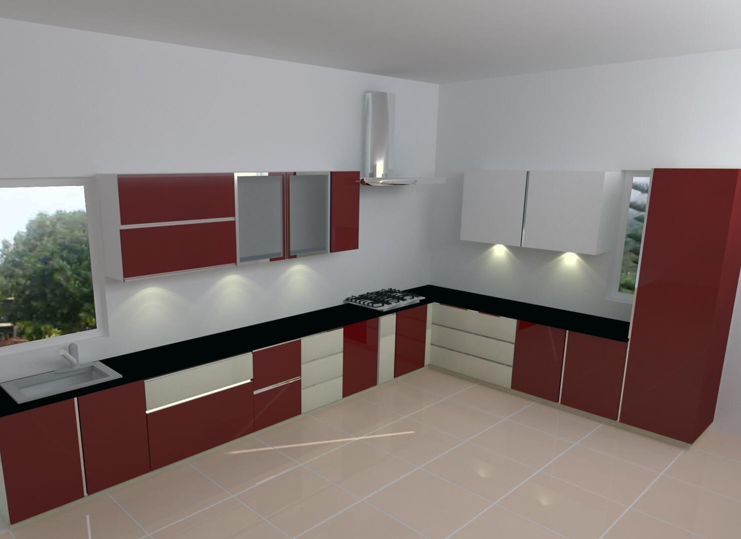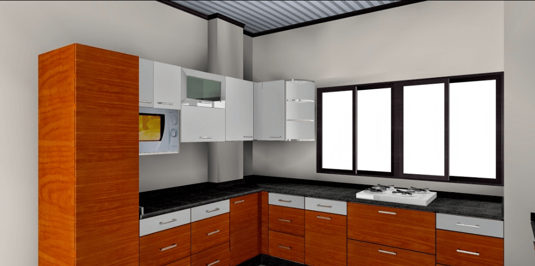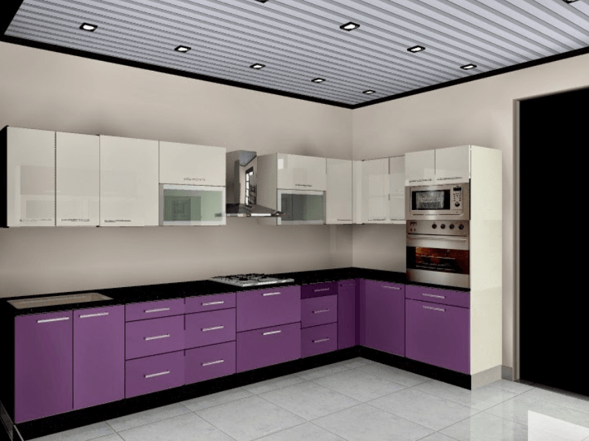 As the name suggests, an L-shaped kitchen, uses two walls of the room, to create an "L"shape. These are quite unobtrusive, and work best in houses with an open plan.
